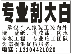 承包个人家装工装内外墙,壁纸、乳胶漆、防水、苯板工程,专业施工团队为您提供优质服务。电话:13104421020