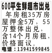 出兑600平生鲜超市年房租35万房屋押金5万55万整体出兑含14个月房租,价格面议13941599845