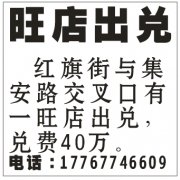 红旗街与集安路交叉口有一旺店出兑,兑费40万。电话:17767746609