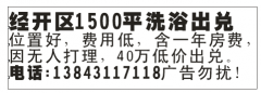 经开区1500平洗浴出兑,位置好,费用低,含一年房费,因无人打理,40万低价出兑。电话:13843117118广告勿扰!