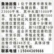 鱼池出售:位于德惠市德发街洪家村有一鱼塘出售,面积23000平米,其中水面15000平米,有水产证,建房用地1500平,现有绿