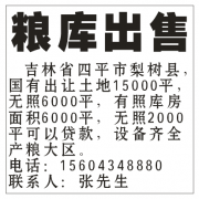粮库出售吉林省四平市梨树县,国有出让土地15000平,无照6000平,有照库房面积6000平,无照2000平可以贷款,设备齐全