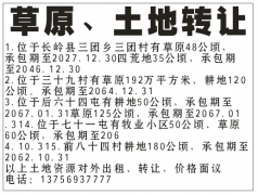 1.位于长岭县三团乡三团村有草原48公顷,承包期至2027.12.30四荒地35公顷,承包期至2046.12.302.位于三十九村有