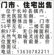 门市、住宅出售:位于长岭县镇内,宏光医院东侧,一、二楼整体出售,门市50平左右,二楼实面积97平,无公摊面积,天然气取