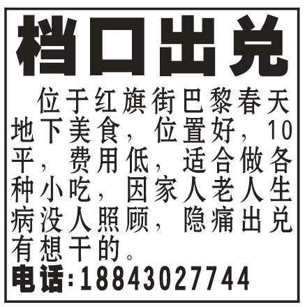 位于红旗街巴黎春天地下美食,位置好,10平,费用低,适合做各种小吃,因家人老人生病没人照顾,隐痛出兑,有想干的。