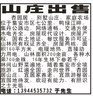 杏园居 ,别墅山庄,家庭农场位于集安市区七公里,鸭绿江畔,集丹公路边。网络通畅,交通方便。水电齐全。房屋现代设计,房屋产权,国有土地证,餐饮服务许可证,山林所有权证齐全,房屋两栋,面积160平方米。电暖地热。直接动力用电。山林面积200余亩。各种水果700余株。16年生林下参若干。林间山野菜遍地,随着集安市全境旅游,红遍全国,走向世界。杏园居山庄,宜居家养老,宜旅游餐宿,宜囤地待发,欢迎有能力,有胆识之士光临。