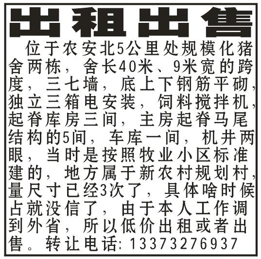 出租出售位于农安北5公里处规模化猪舍两栋,舍长40米✘9米宽的跨度,三七墙,底上下钢筋平砌,独立三箱电安装,饲料搅拌机,起脊库房三间,主房马尾结构的5间,车库一间,机井两眼,当时是按照牧业小区标准建的,地方属于新农村规划村,量尺寸已经3次了,具体啥时候占就没信了,由于本人工作调到外省,所以低价出租或者出售。转让电话:13373276937.