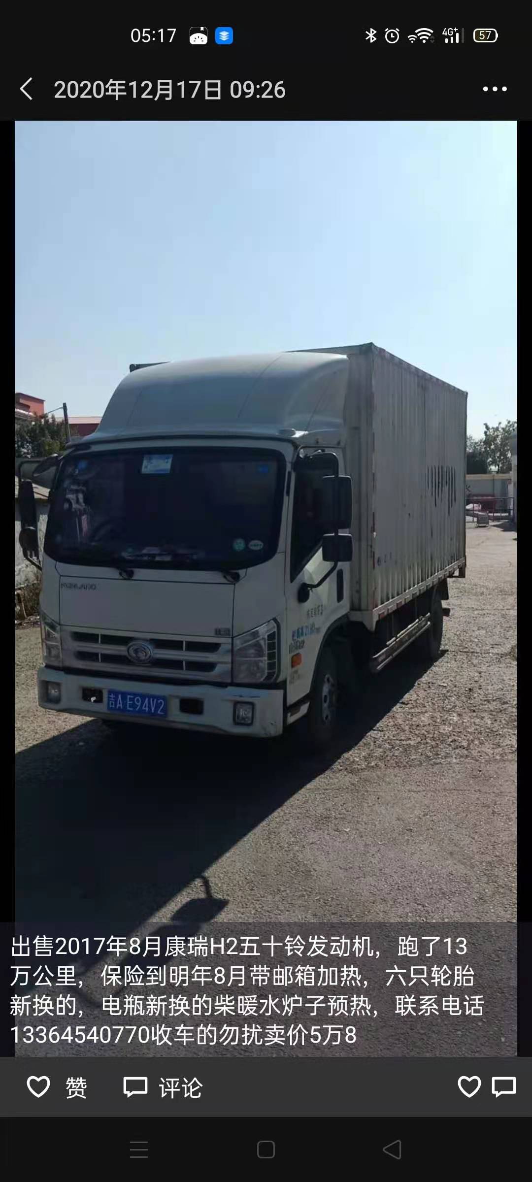 出售2017年8月康瑞H2五十铃发动机,跑了13万公里,保险到明年8月带邮箱加热,六只轮胎新换的,电瓶新换的柴暖水炉子预热,联系电话13364540770收车的勿扰卖价5万8