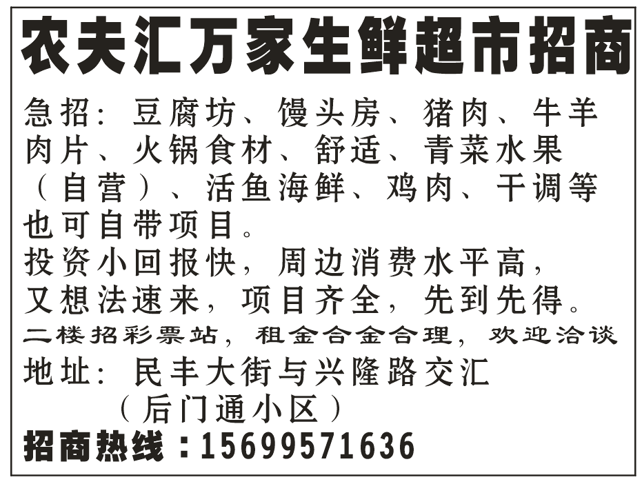 招商项目:豆腐房、综合面食、蛋糕房、粗粮、切面、水产、蔬菜、水果、熟食、咸菜、猪肉