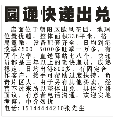 店面位于朝阳区欧风花园,地理位置优越,整体面积336平米,格局宽敞,设备配套齐全,日均到港淡季4500-5000多旺季一万多,有两个大学,直送驿站七八个,快递员都是三年以上的老快递员,成熟稳定,日均出港800多,有固定合作客户,接手可帮助过度扶持,负责片区大,由于另有其他买卖,经营不过来所以整体出兑,具体价格面议,有意者电话沟通,欢迎实地考察,中介勿扰,张先生,电话15144444210