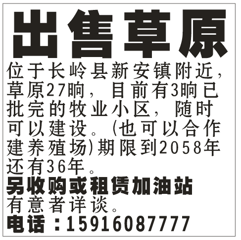 位于长岭县新安镇附近,草原27晌,目前有3晌已批完的牧业小区,随时可以建设。(也可以合作建养殖场)期限到2058年,还有36年。
