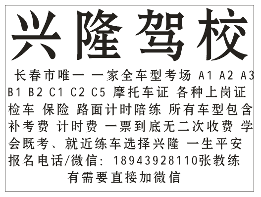 兴隆驾校 长春市唯一 一家全车型考场 A1 A2 A3 B1 B2 C1 C2 C5 摩托车证 各种上岗证 检车 保险 路面计时陪练 所有车型