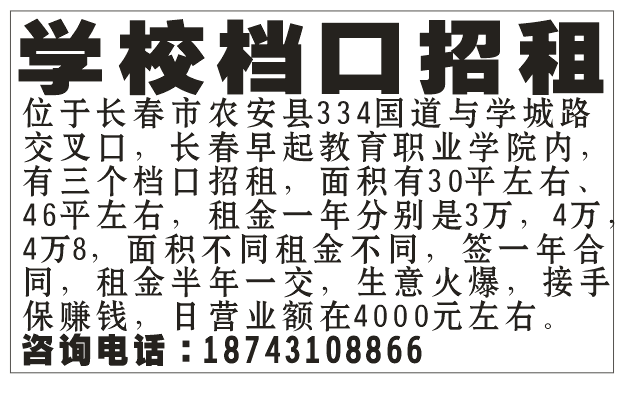 位于长春市农安县334国道与学城路交叉口,长春早起教育职业学院内,有三个档口招租,面积有30平左右、46平左右,租金一年分别是3万,4万,4万8,面积不同租金不同,签一年合