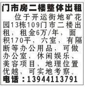位于开运街地矿花园13栋109门市二楼出租,租金6万/年,面积170平,六室,有隔断等办公用品,可做