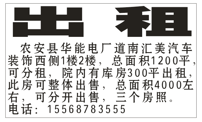 农安县华能电厂道南汇美汽车装饰西侧。 1楼2楼。总面积1200平。可分租。院内有库房300平出租。